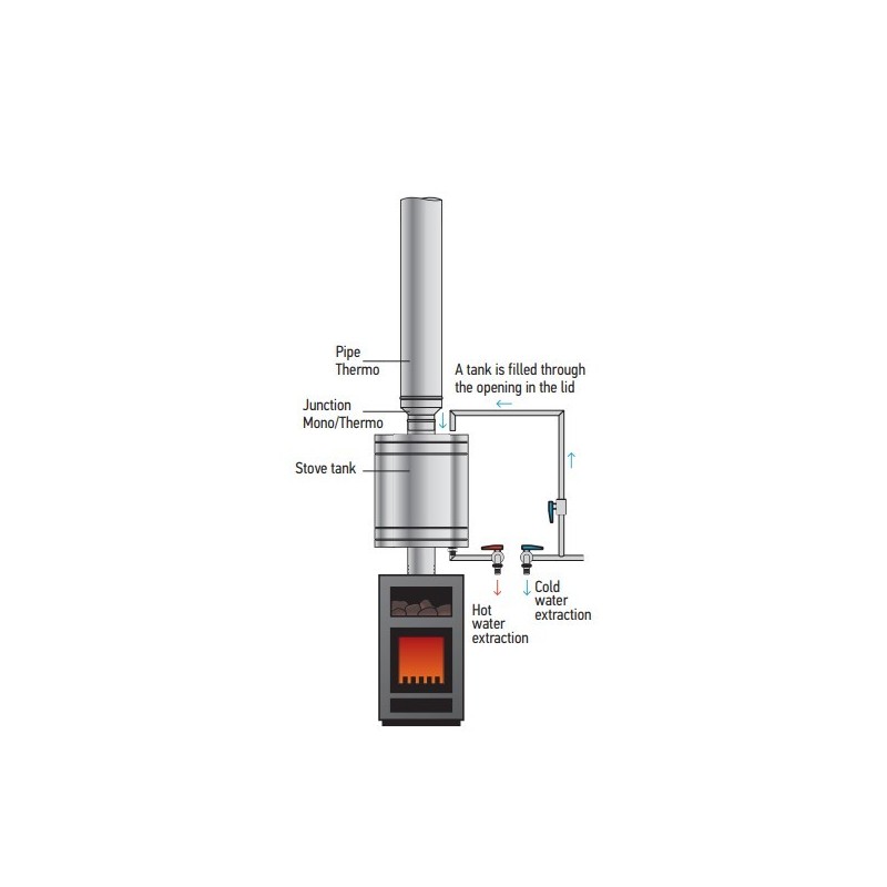 Vandens šildymo samovaro tipo bakelyje principas. Deginant malkas, kaminas šildomas. Tuo pačiu metu bake esantis vanduo pašildomas. Rezervuare vanduo pašildomas iki 70-75°C temperatūros, kol garų pirtyje pasieks 90°C ir kai garinama vantos.